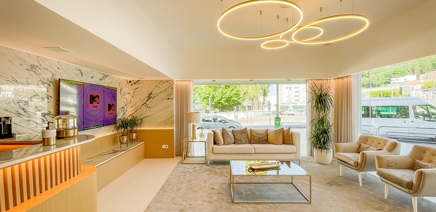 Os tons pastel e dourados em harmonia com a utilização das madeiras e dos pormenores de mármore criam um ambiente acolhedor e de requinte nos espaços comuns desta fantástica clínica.